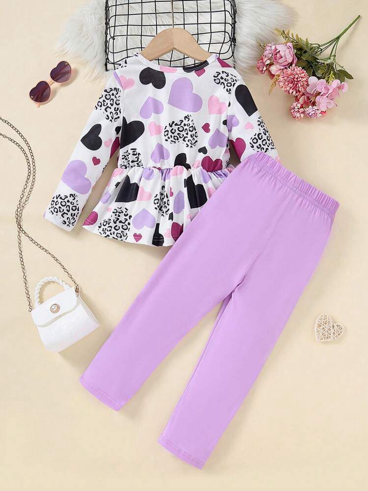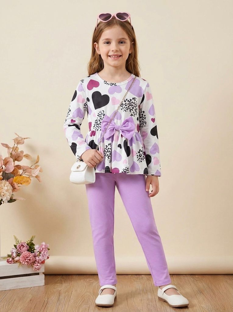 Let your little girl shine with this Trendy Heart Print Top & Leggings Set, designed for ages 1 to 14 years. The outfit features a beautiful peplum-style top with a big bow at the waist, decorated with soft pastel and bold heart prints for an adorable and stylish look. Paired with comfortable stretchable purple leggings, this set is perfect for daily wear, outings, parties, family functions, and photoshoots.