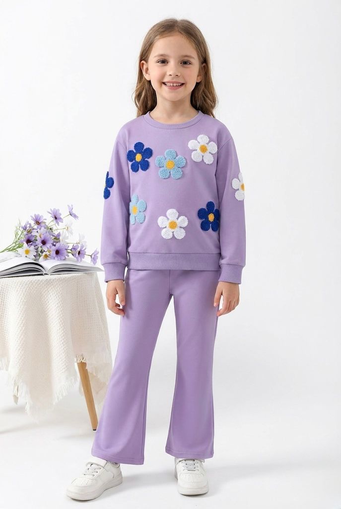 Brighten your little girl’s wardrobe with this adorable Lavender Daisy Flower Co-ord Set, designed for comfort, warmth, and style. This beautiful outfit includes a soft fleece sweatshirt decorated with cute 3D textured daisy flowers in blue, white, and pastel shades, paired with trendy bell-bottom pants for a fashionable look.