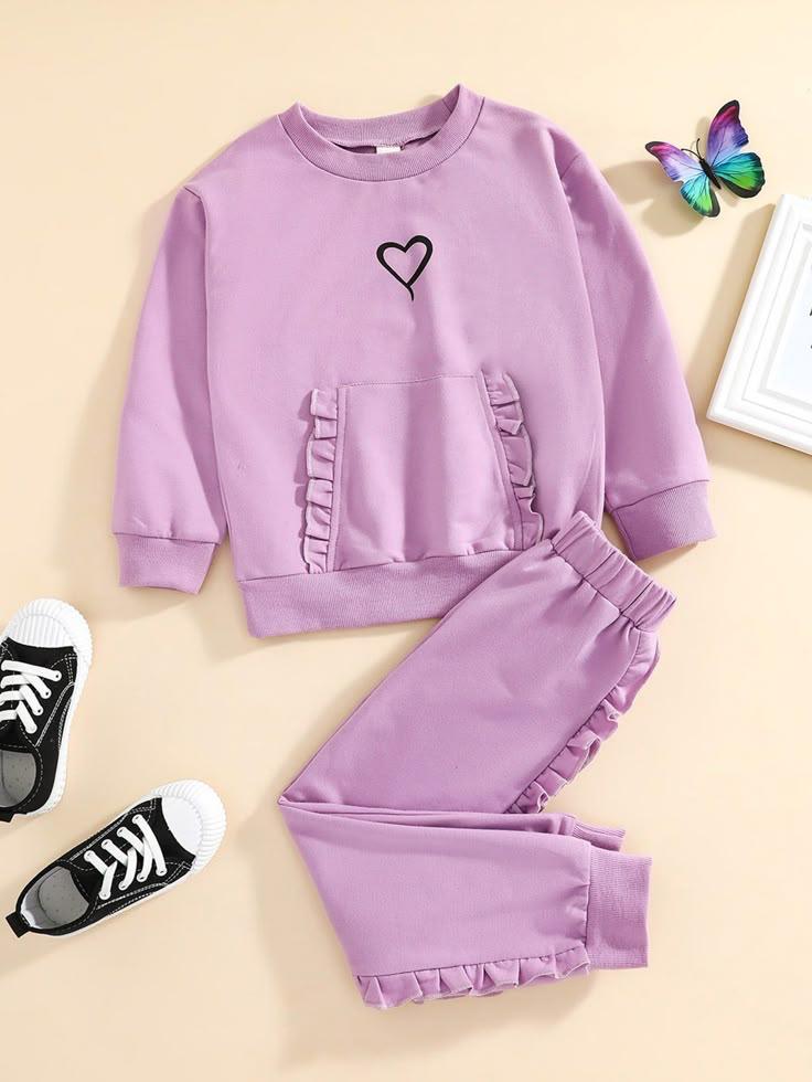 Give your little girl the perfect blend of comfort and cuteness with this Lavender Heart Print Sweatshirt & Jogger Co-Ord Set. Made from soft, breathable and skin-friendly fabric, this outfit is ideal for winter and all-season casual wear. The top features a stylish heart print, cute ruffle detailing, and a cozy kangaroo pocket, paired with matching joggers that include elegant ruffle trims for a premium look.