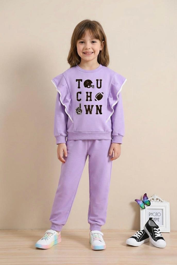 Give your little girl a stylish and cozy winter look with this Girls Purple Touchdown Printed Sweatshirt & Jogger Set. Made from premium soft cotton blend fabric, this co-ord set ensures all-day comfort and warmth. The sweatshirt features cute frill sleeves, sporty touchdown print, and ribbed cuffs, paired with matching elastic-waist jogger pants for a perfect fit.