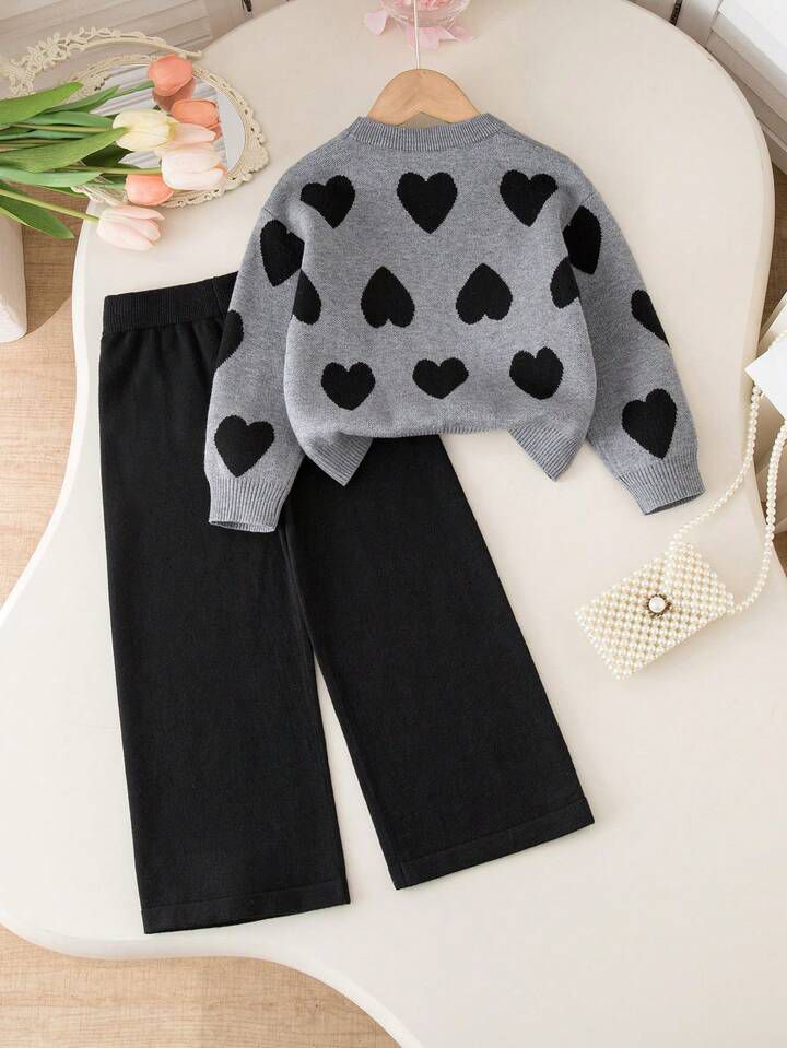 Keep your little girl warm and fashionable with the Glozin Girls’ Heart Knit Sweater & Pants Set. Designed with love and crafted for comfort, this adorable outfit features a soft grey knit sweater decorated with cute black heart patterns and paired with elegant wide-leg black pants. It’s the ideal blend of warmth, style, and everyday comfort, perfect for girls aged 1 to 14 years. ❄️🖤👧