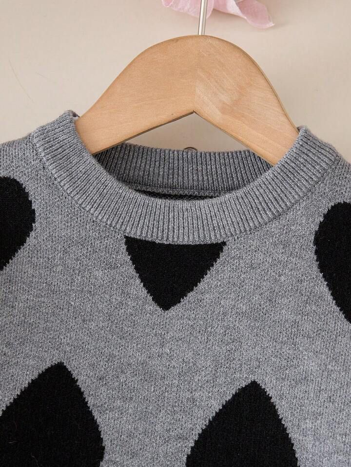 Soft grey knit with bold black heart motifs for a charming and trendy winter look.