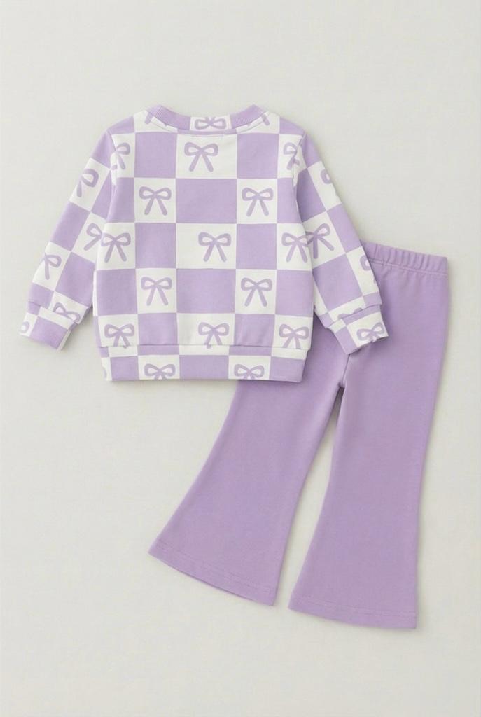 Upgrade your little girl’s winter wardrobe with this adorable Lavender Bow Print Co-Ord Set, featuring a soft sweatshirt with a trendy checkered bow design and matching bell-bottom leggings. The cute bow detail on the pant adds extra charm, making it the perfect outfit for stylish winter days.