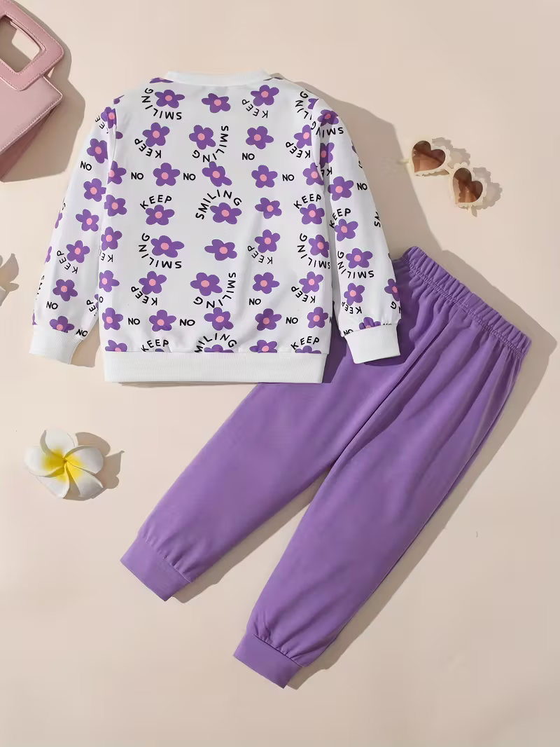 Made from premium soft cotton blend fleece, the sweatshirt features cute floral prints with Keep Smiling text, paired with comfy purple jogger pants having elastic waistband and cuffs for a perfect fit.